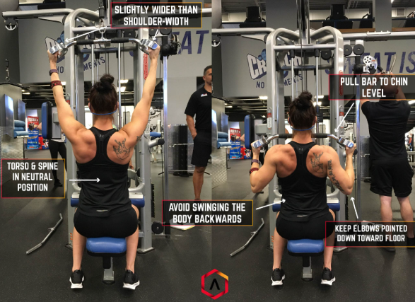 광배근 운동의 기본. 기구를 어깨보다 넓게 잡고 천천히 끌어당겨 광배근을 수축시키며 등 전체를 자극할 수 있습니다.