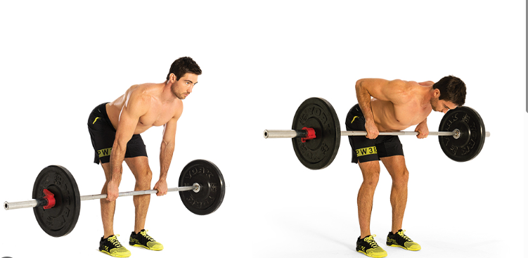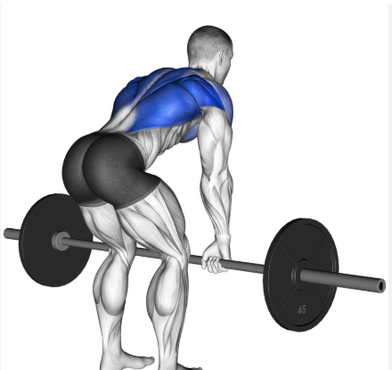 허리를 숙인 자세에서 바벨을 몸쪽으로 끌어당기며 등 전체를 사용하는 고강도 운동입니다.