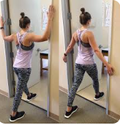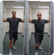 - 문틀에 양 팔을 90도 각도로 올려서 대고 한 발 앞으로 내딛습니다.