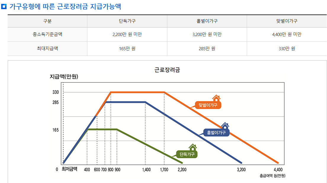 - 소득요건: 근로·사업·종교인 소득이 가구유형별 기준금액 미만이어야 합니다.