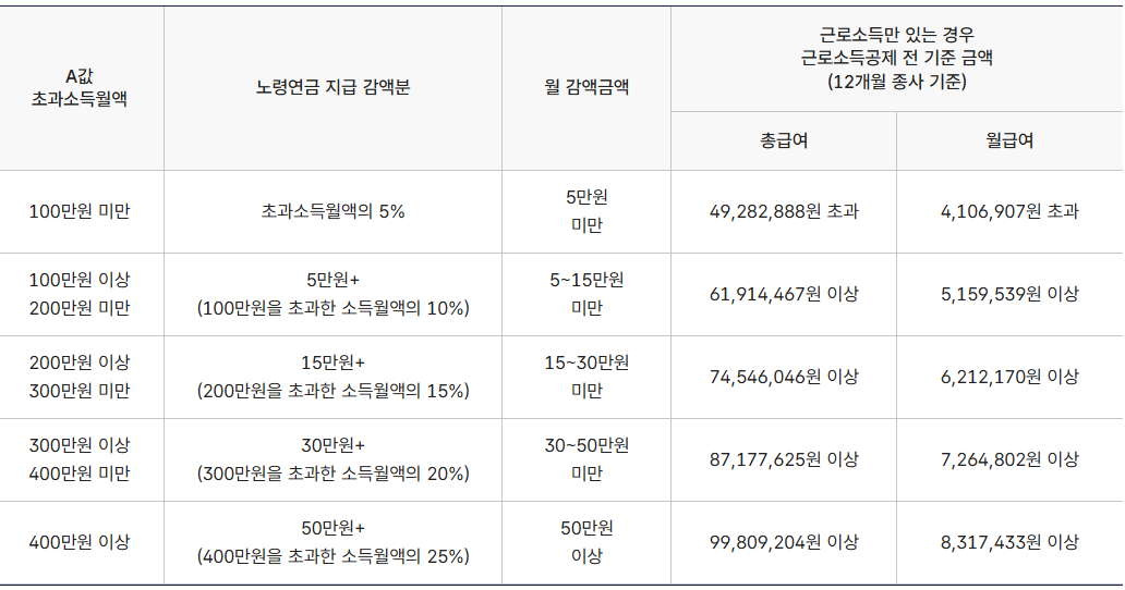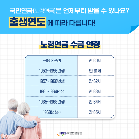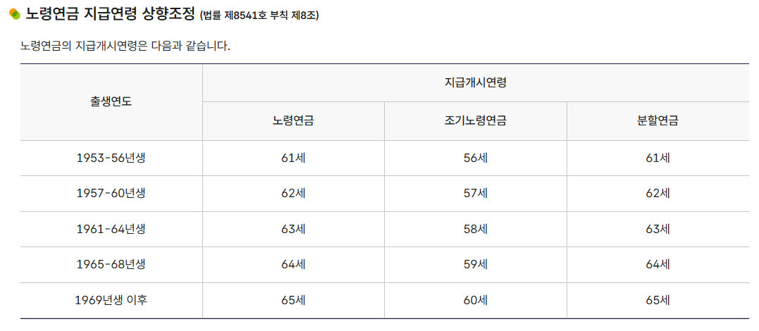 | 수령 시작 나이 | 55세~59세 | 60세~65세(출생연도 기준) |