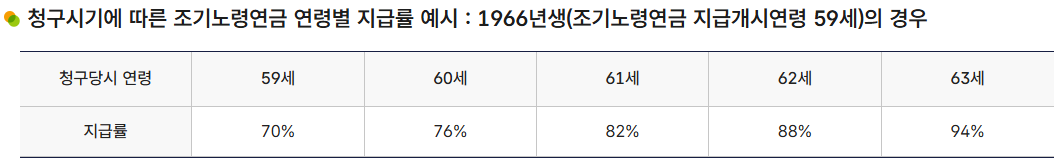 일찍 신청할수록 감액 비율이 커지기 때문에, 가능하다면 59세에 신청하는 것이 유리합니다.