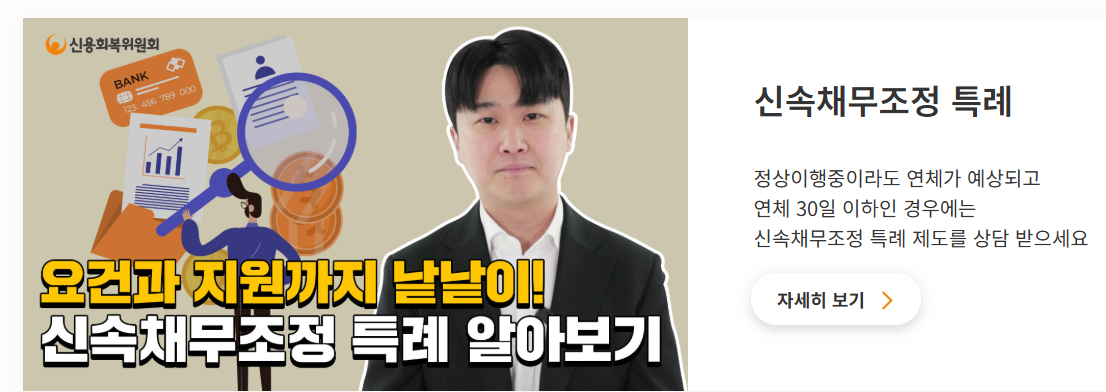 | 신속 채무조정 | 최대 70% 원금 감면, 최대 10년 상환 유예 | 신용회복위원회 |